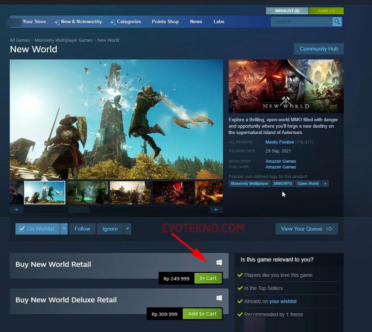 - Pertama buka launcher Steam, kemudian cari game/aplikasi yang akan Anda beli. Setelah itu klik “In Cart” (Masukan Keranjang)