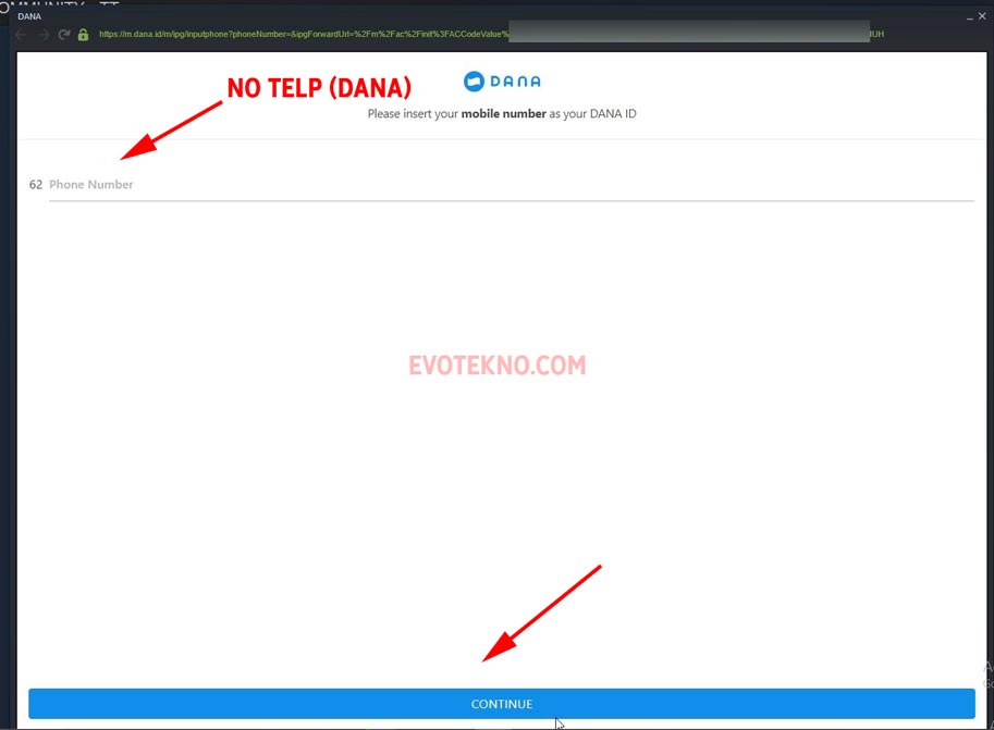 - Kelima, nantinya akan muncul jendela baru, pada bagian ini masukan nomor telepon yang terdaftar dengan Dana. Lalu klik “Continue“