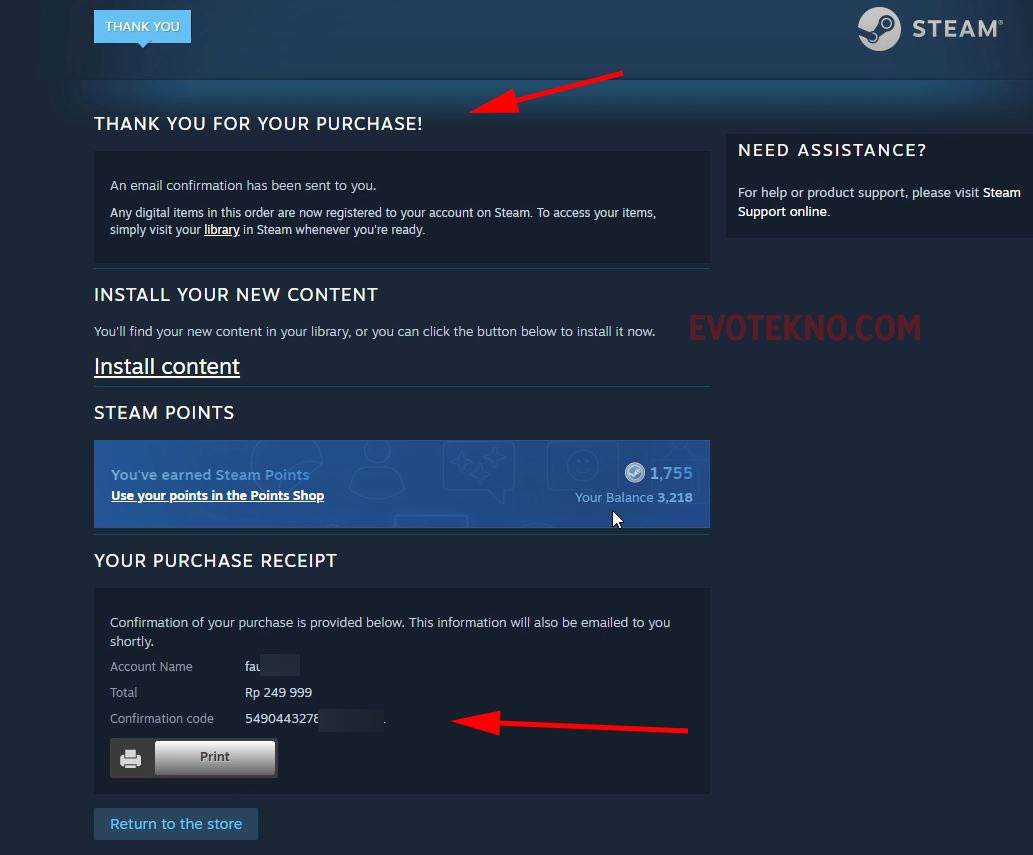 - Jika berhasil, Anda akan di arahkan ke halaman “Thank you for your Purchase” dan biasanya jika masuk ke halaman tersebut, game yang Anda beli akan masuk ke Library.