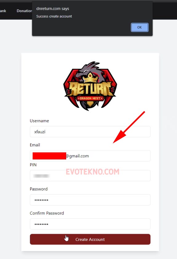 - Jika sudah isi semua, klik ‘Create Account’, jika berhasil akan muncul pop-up yang bertuliskan “success create account”, dan dari situ juga Anda langsung bisa login di launcher.