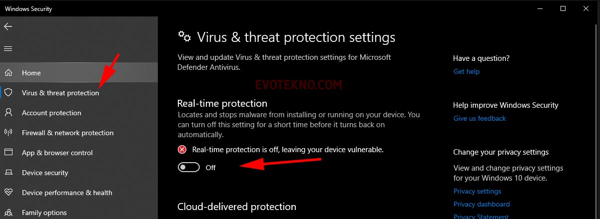 - Lalu pada bagian Virus & threat protection, matikan Real-time protection
