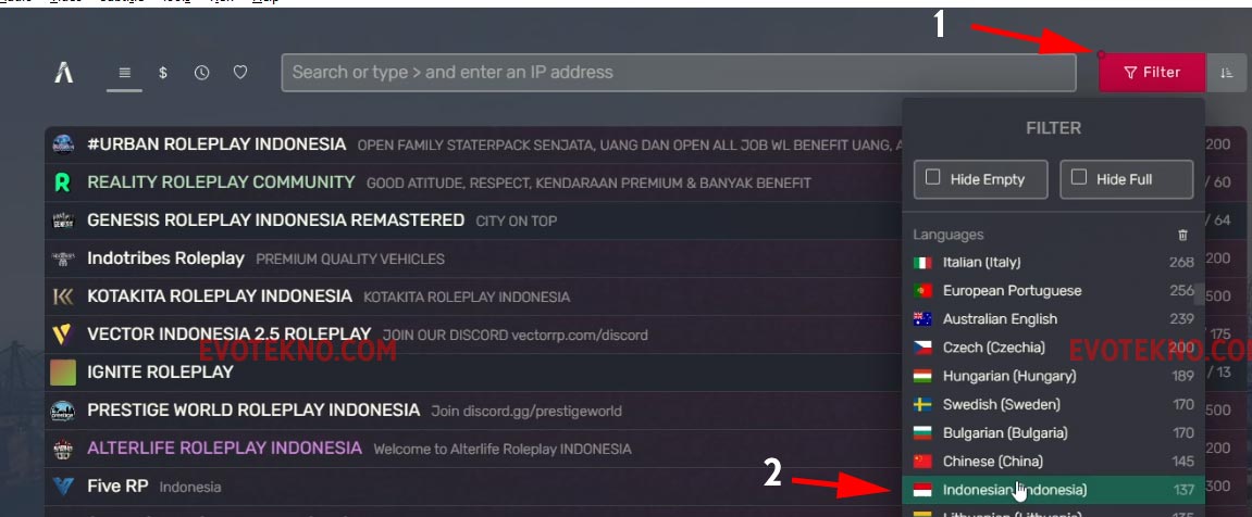 - Pilih Filter negara Indonesia, lalu pilih server mana yang ingin Anda masuki.