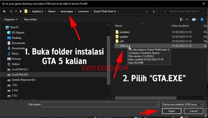 - Lalu setelah download, Anda harus verifikasi antara FiveM dan file GTA5.exe; cari file tersebut pada folder instalasi GTA 5, biasanya alamat foldernya: