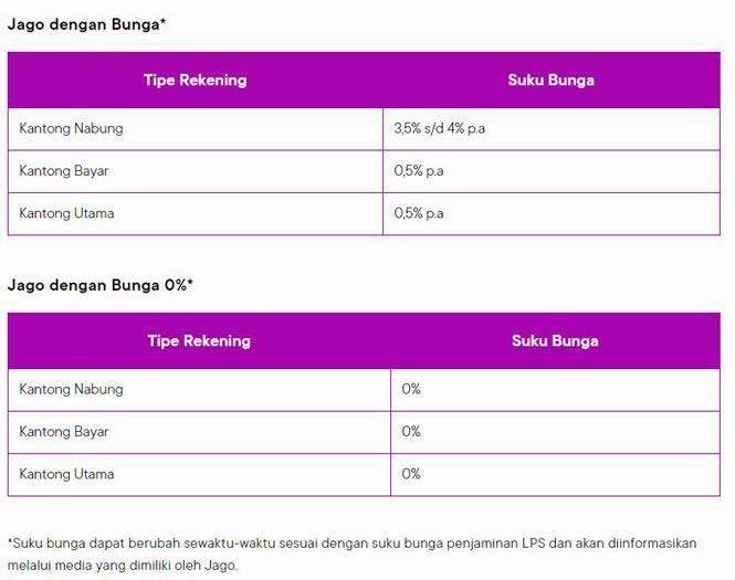 Namun jika Jago dengan bunga 0%, tidak ada bunga bilamana Anda menyimpan pada periode apapun. Biasanya pilihan ini ditujukan untuk penganut Islam, yakni bertujuan menghindari bunga.