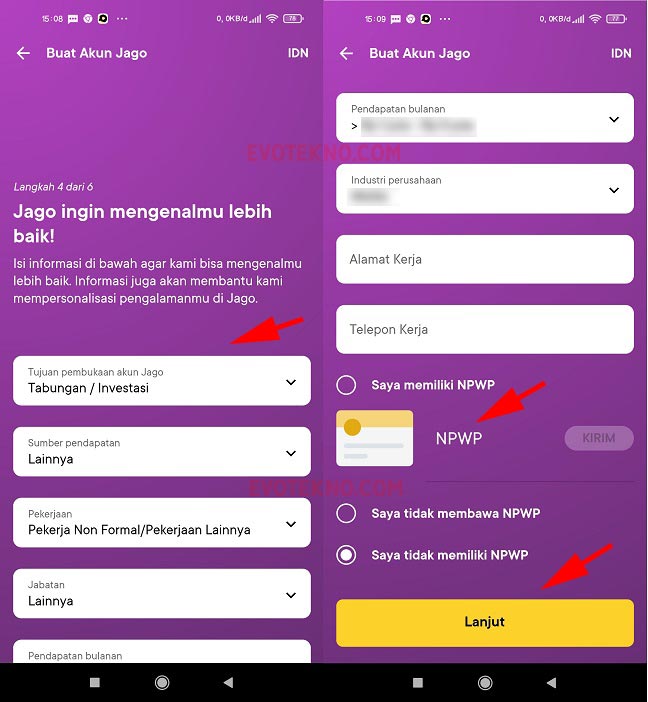 - Langkah keempat, isi informasi pribadi seperti tujuan pembukaan akun jago, sumper pendapatan, jabatan, pendapatan bulanan, perusahaan, alamat kerja, telepon kerja dan terakhir NPWP, jika sudah diisi klik “Lanjut“