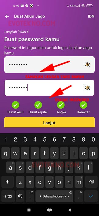 - Langkah ketiga, isi password yang akan diberikan untuk akun Jago nantinya. Pastikan semua syarat password tercentang semuanya.