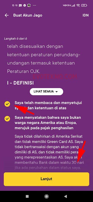 - Langkah keenam, baca semua syarat dan ketentuan dari bank Jago, jika setuju centang dan klik “Lanjut“