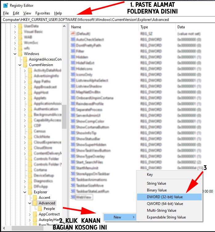 3. Setelah buka folder “Advanced”, klik kanan pada bagian kosong lalu klik “New” kemudian buat file “DWORD (32-bit) Value)Registry Editor - Advanced - Memunculkan Detik pada Jam Windows