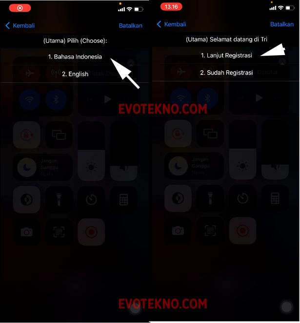 - Menu ini muncul secara otomatis, setelah kartu SIM terpasang. Klik bahasa Indonesia, lalu “Lanjut Registrasi“