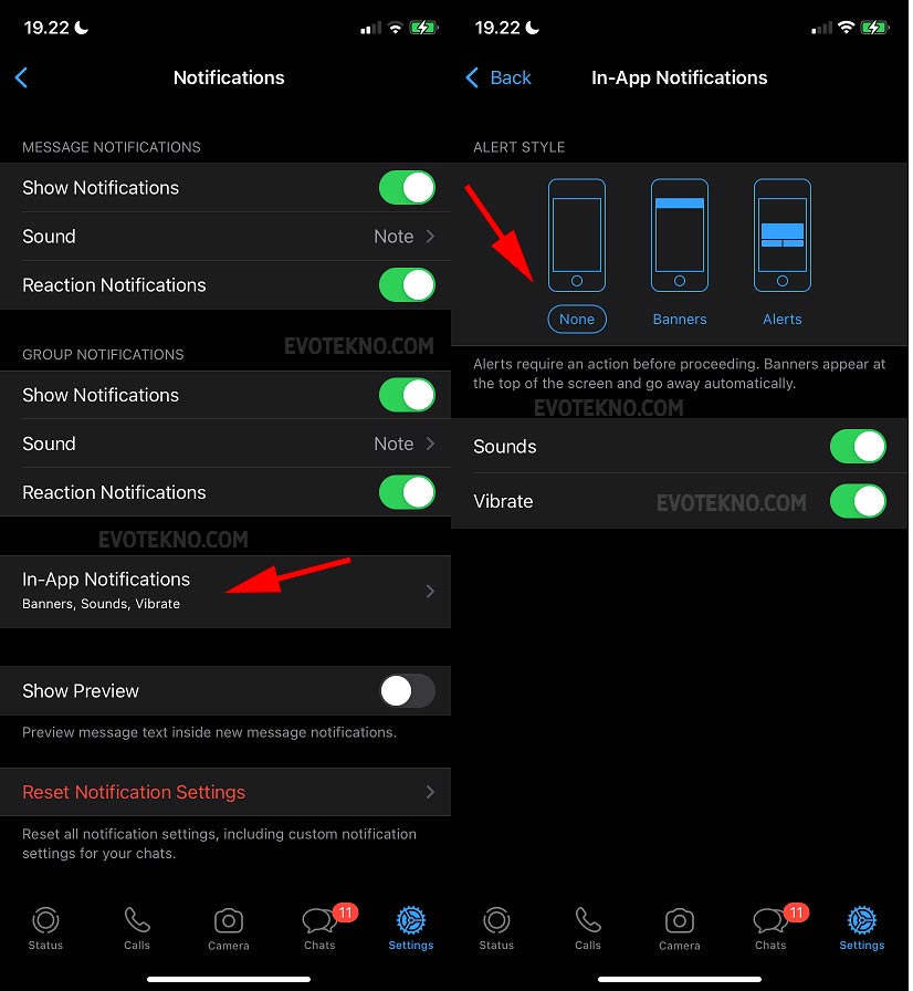 - Pada bagian “In-App Notifications” ubah pengaturannya dari Banner ke “None“