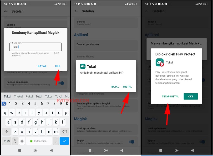 - Nah, pada bagian ini beri nama pengganti untuk Magisk, nama ini bebas, kalau saya sendiri isi “Tukul“, lalu izinkan beberapa perizinan yang akan muncul.