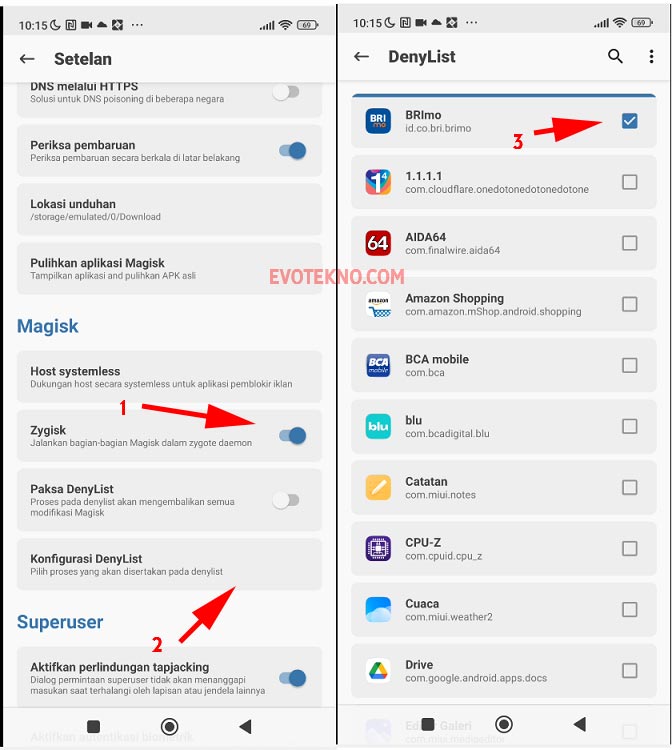 - Selanjutnya pada bagian “Konfigurasi DenyList” cari dan centang bank yang sekiranya ingin Anda sembunyikan dari Magisk.