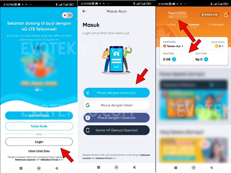 - Terakhir klik “Masuk dengan nomor by.U” nantinya akan otomatis mendeteksi, dan akan masuk ke halaman utama by.U disana akan terlihat informasi nomor, pulsa dan kuota