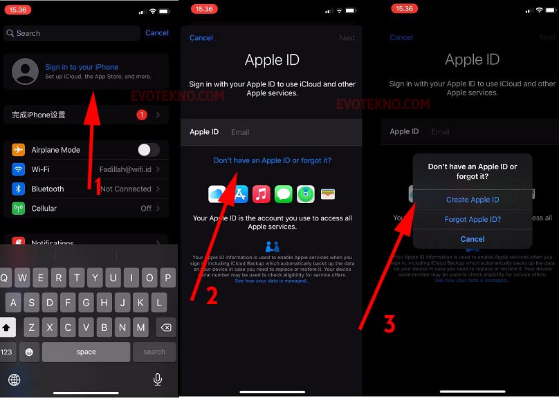 - Buka Settings, kemudian klik ikon profil “Sign in to your iPhone”, karna kita tak punya akun, klik “Don’have an Apple ID or forgot it“, untuk membuat akun klik “Create Apple ID“