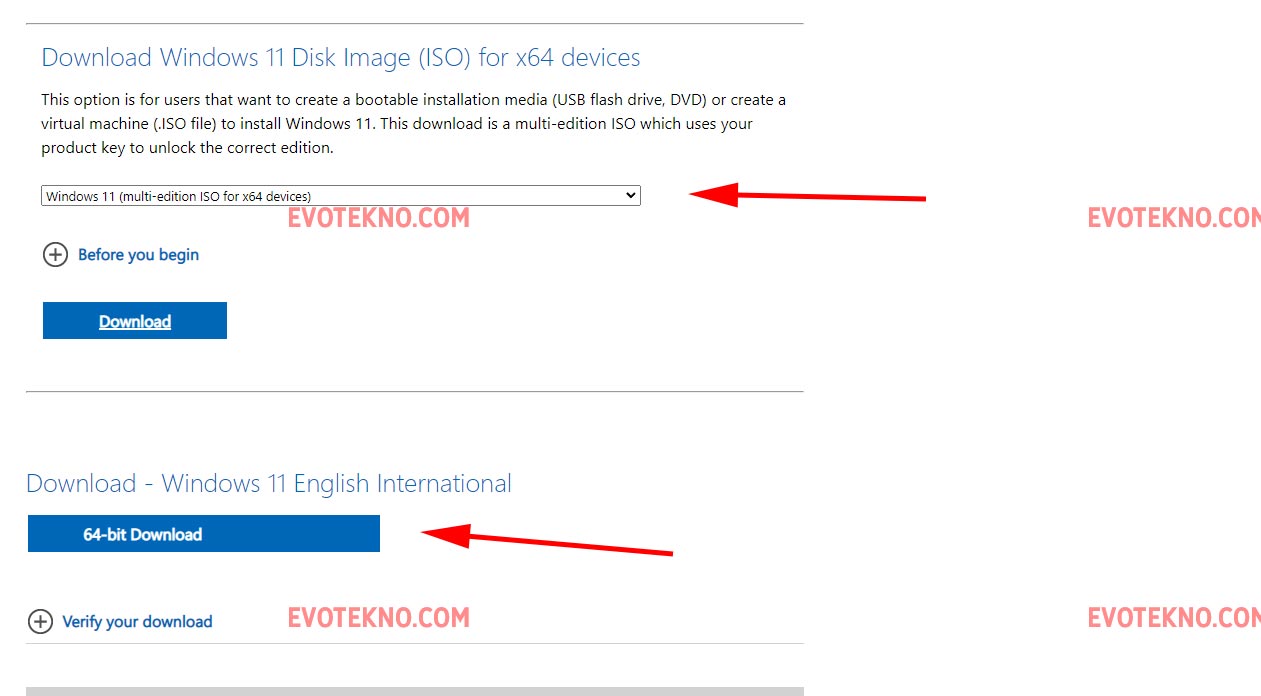 - Scroll kebawah, pada bagianDownload Windows 11 Disk Image (ISO) for x64 devices, pilih versinya lalu klik “Download“