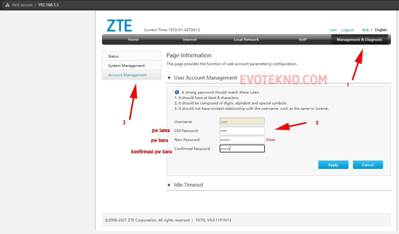 - Setelah masuk, klik menu “Management & Diagnosis“, lalu klik “Account Management“. Nah, tugas Anda sekarang masukan password lama dan password baru.
