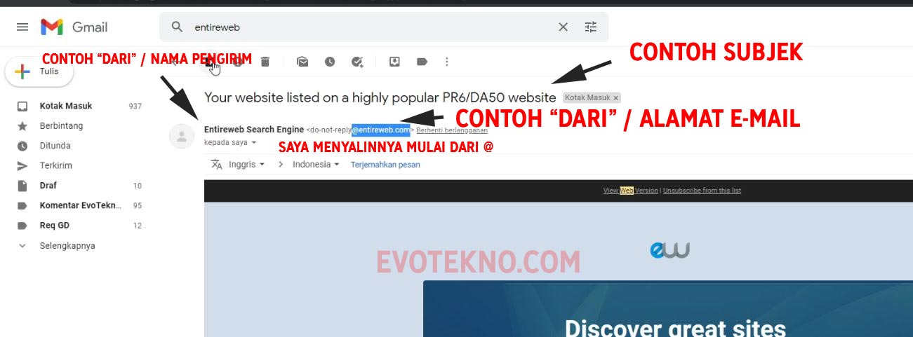 Saya akan menghapus semua pesan yang berasal dari alamat e-mail “@entireweb.com” dan juga pesan-pesan yang berhubungan dengan kata kunci “entirew*b”