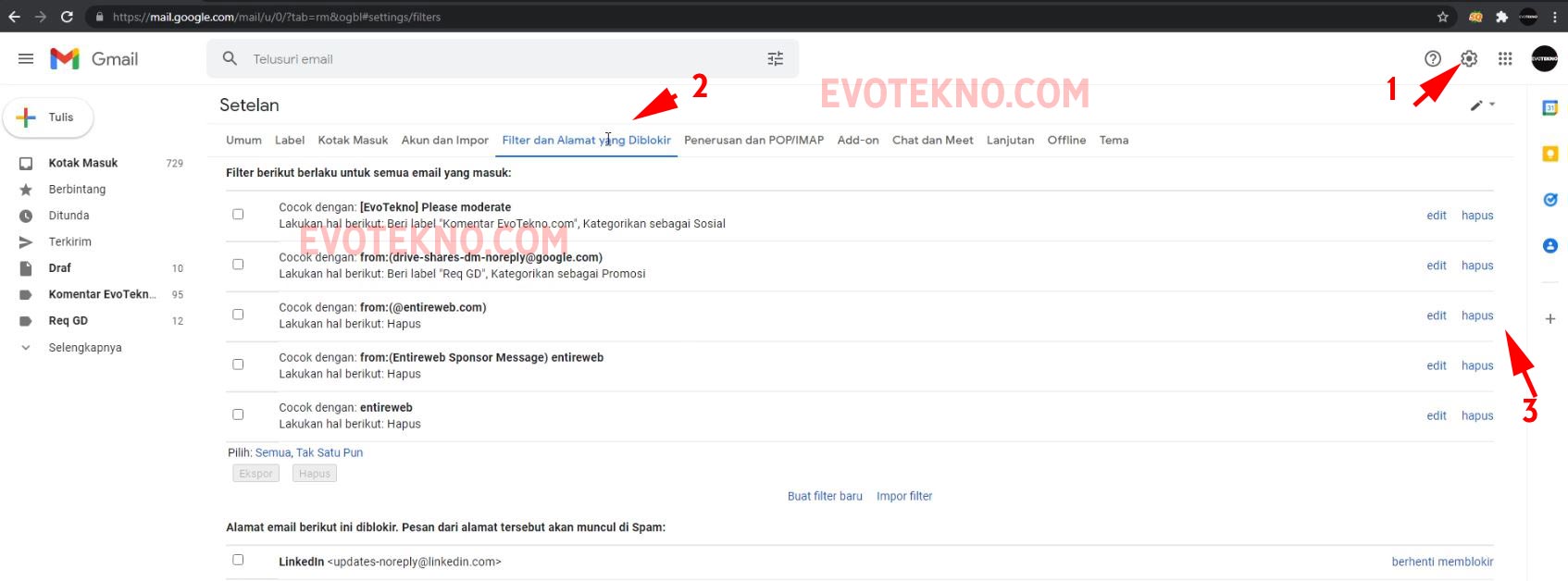 - Setelah itu klik pengaturan “Filter dan Alamat yang diblokir“
