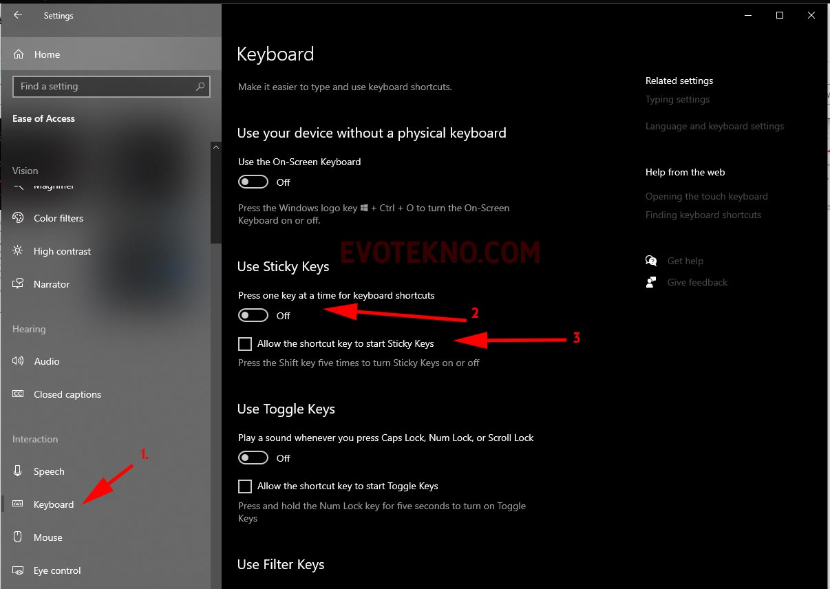 - Cari pengaturan Keyboard, lalu pada bagian “Use Sticky Keys” tugas Anda tinggal nonaktifkan fiturnya dan hapus centang juga pengaturan “Allow the shortcut key to start key”