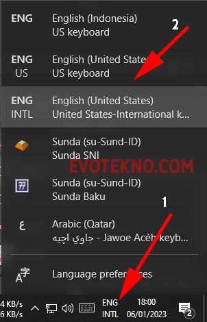 4. Nah untuk mengaktifkan keyboard United States International, klik icon input methods yang ada di sudut kanan bawah, dekat jam, lalu pilih yang International tadi.cara gantiinput method keyboard windows