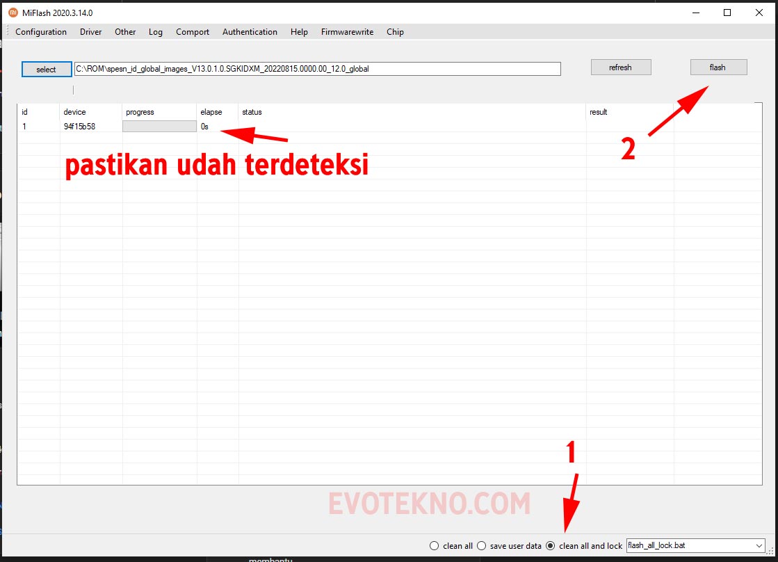 - Untuk memastikan apakah HP Anda terdeteksi oleh MiFlash klik tombol “refresh“