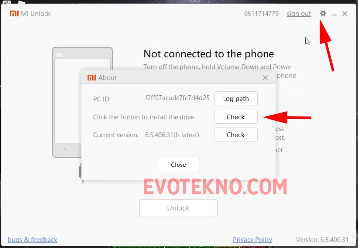 - Cara kedua install driver dari aplikasi Mi Unlock, caranya klik icon gerigi lalu dibagian Click the button to install drive klik “Check“