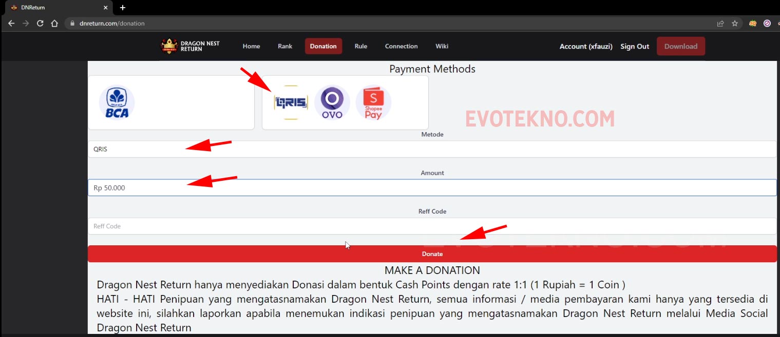 3. Metode pembayaran pilih “QRIS” dan pilih juga nominal yang tersedia, masukan kode refferal jika perlukan, terakhir klik “DonateDonation QRIS- Nominal DN Return