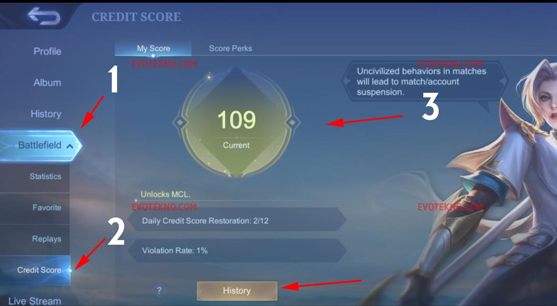 Credit Score maksimal adalah 110, semakin tinggi keuntungan atau “Perks” yang Anda dapatkan dari Mobile Legends semakin tinggi, maka wajib maintain jangan sampai melanggar peraturan Moonton.