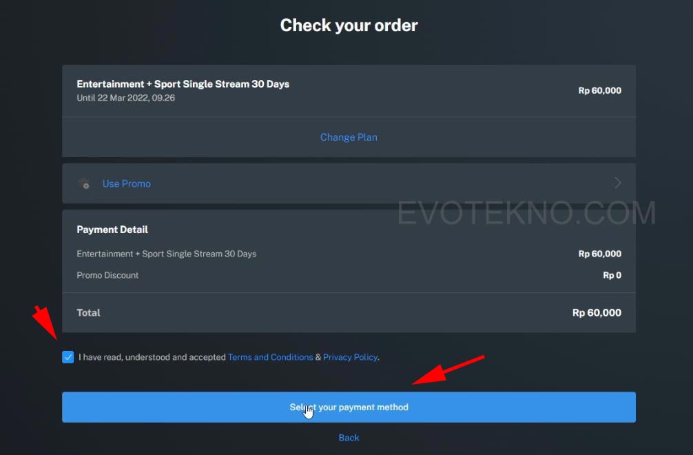 3. Selanjutnya pada laman checkout, Anda bisa memasukan kode promo jika punya. Setelah itu klik “Select your payment methodSelect a payment method Mola TV