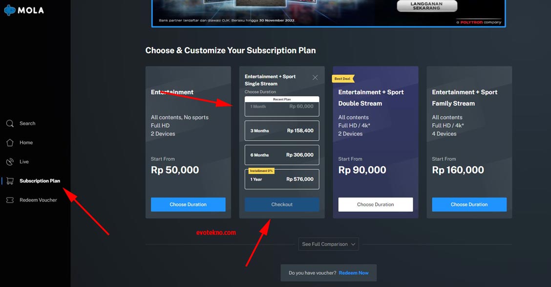 2. Kemudian buka menu yang ada disamping, klik menu “Subscription Plan“, lalu pilih paket yang Anda butuhkan saya sendiri karna ingin nonton olah raga maka memilih “Entertaintment & Sport“, setelah itu klik “CheckoutSubcription Plan Mola TV