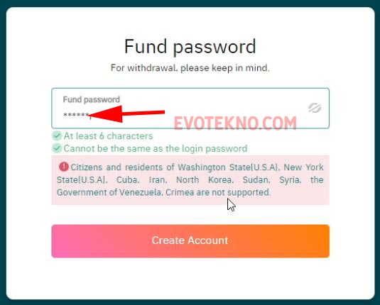 - Kedua nantinya Anda diperintah untuk memasukan “Fund Password“. Nah bedakan dengan password utamaya. Fund Password ini berguna untuk verifikasi ketika kita withdraw dan trading.