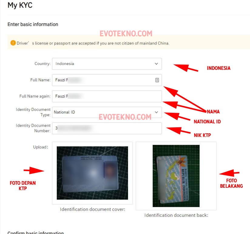- Nah, pada laman verifikasi KYC, tentunya Anda pilih region Indonesia. Jika pilih National ID (KTP), jangan lupa isi nama yang sesuai dengan KTP, serta pada kolom Identity Document Number isi dengan NIK KTP
