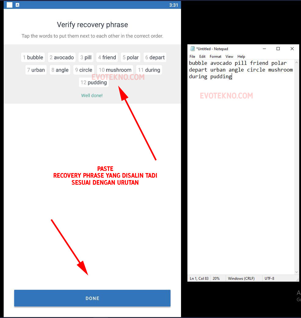 Sekali lagi saya katakan lagi recovery phrase bagaikan kunci/password, jadi angan sampai lupa dan jangan beri tahu siapapun.