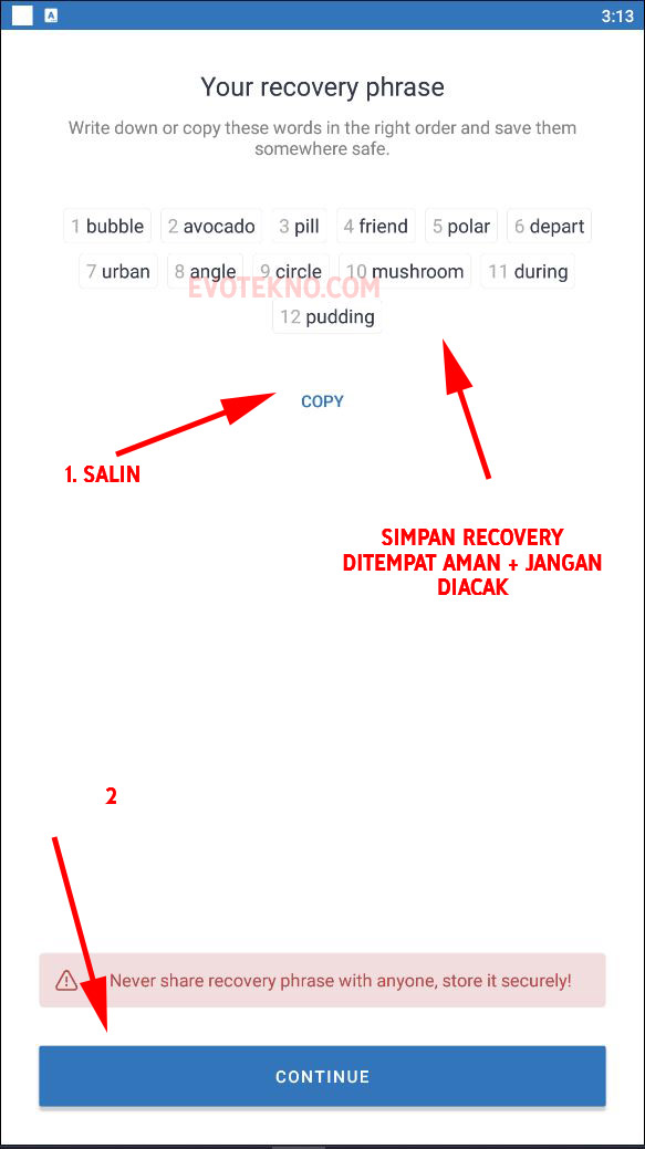 Maka nanti Anda harus menyimpan recovery phrase ditempat yang paling aman.