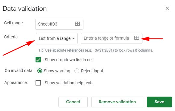 - Pada ‘Criteria’ pilih ‘List from the range‘ kemudian klik ikon ‘Select data range‘ yang berbentuk kotak-kotak.