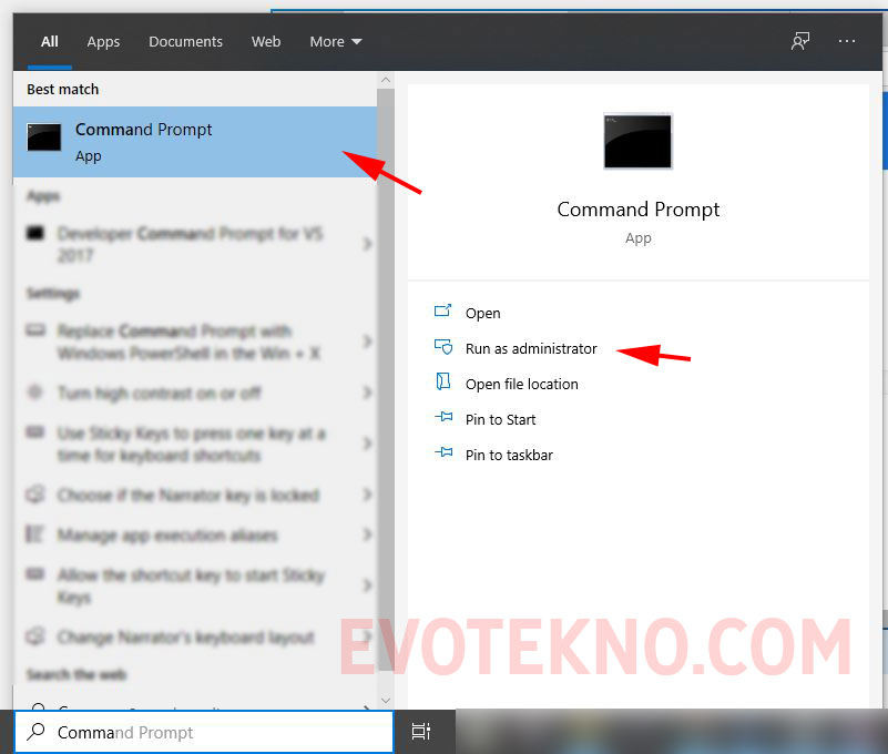 - Buka command prompt tapi dengan cara Run as Administrator. Caranya tuliskan “command prompt” pada pencarian Windows, lalu klik “Run as Adminitrator“