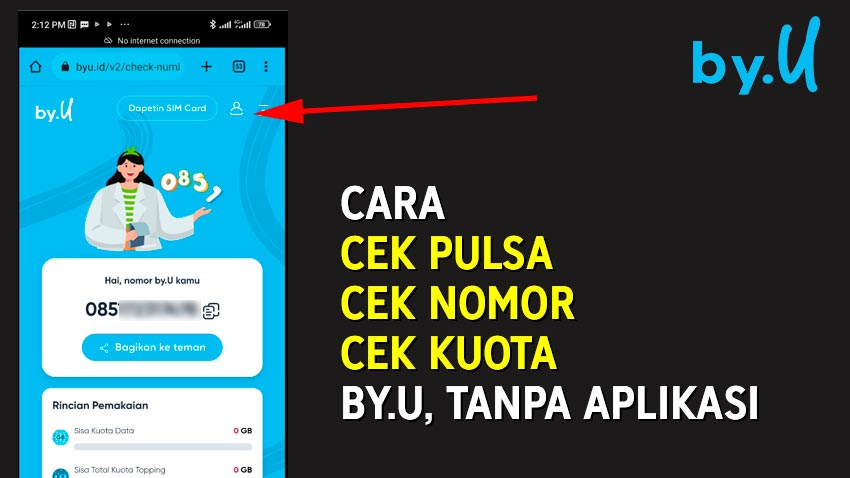 - Terakhir klik “Masuk dengan nomor by.U” nantinya akan otomatis mendeteksi, dan akan masuk ke halaman utama by.U disana akan terlihat informasi nomor, pulsa dan kuota