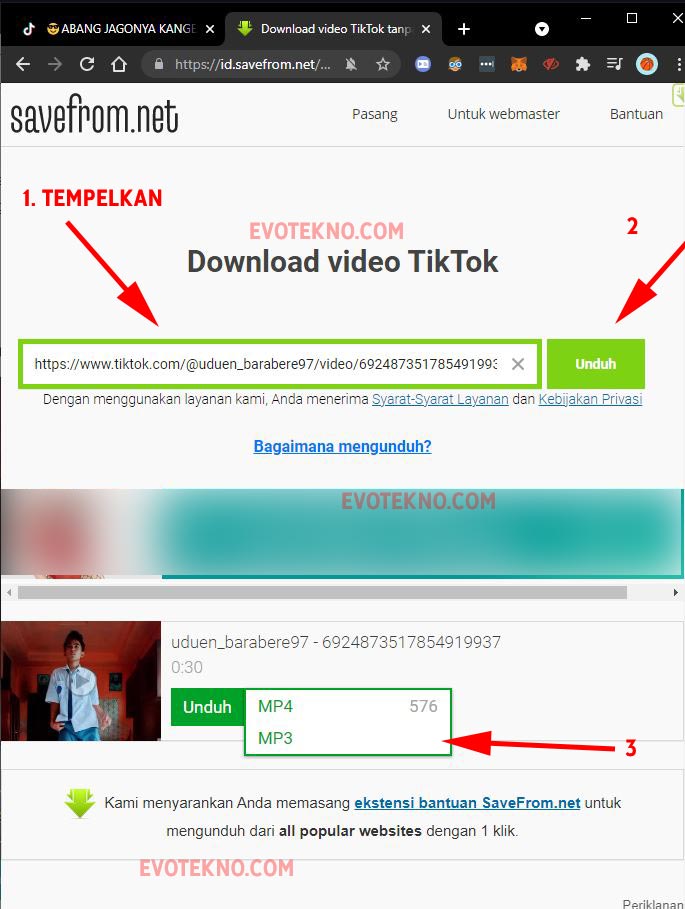 - Selanjutnya buka website downloader, kemudian tempelkan link yang tadi disalin. Lalu klik “Unduh”, terakhir klik pilih format .MP3 nantinya akan otomatis terunduh pada browser Anda.