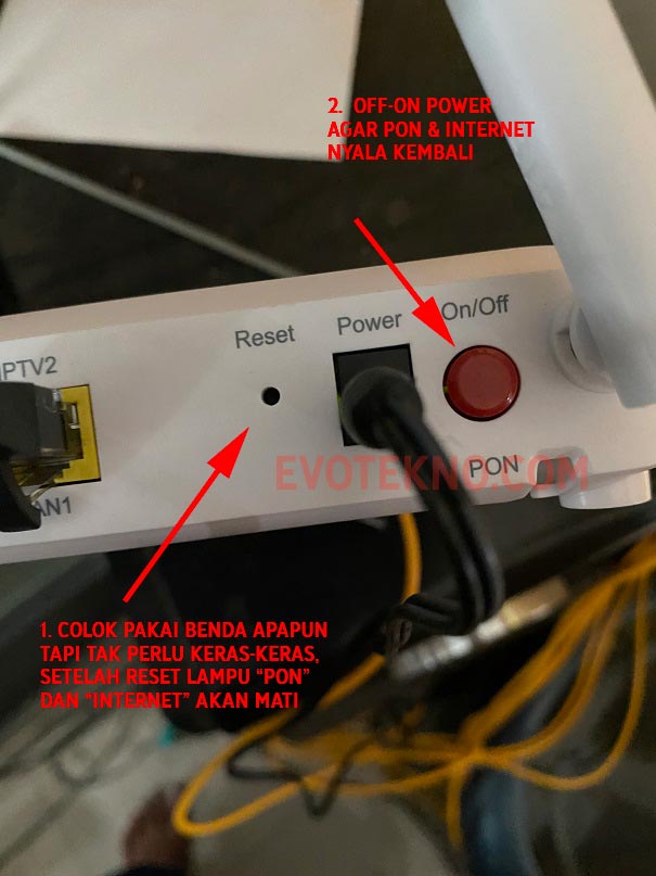 - Nantinya seperti lampu PON & Internet akan mati, nah agar nyala kembali coba off-on modemnya, dengan menekan tombol power