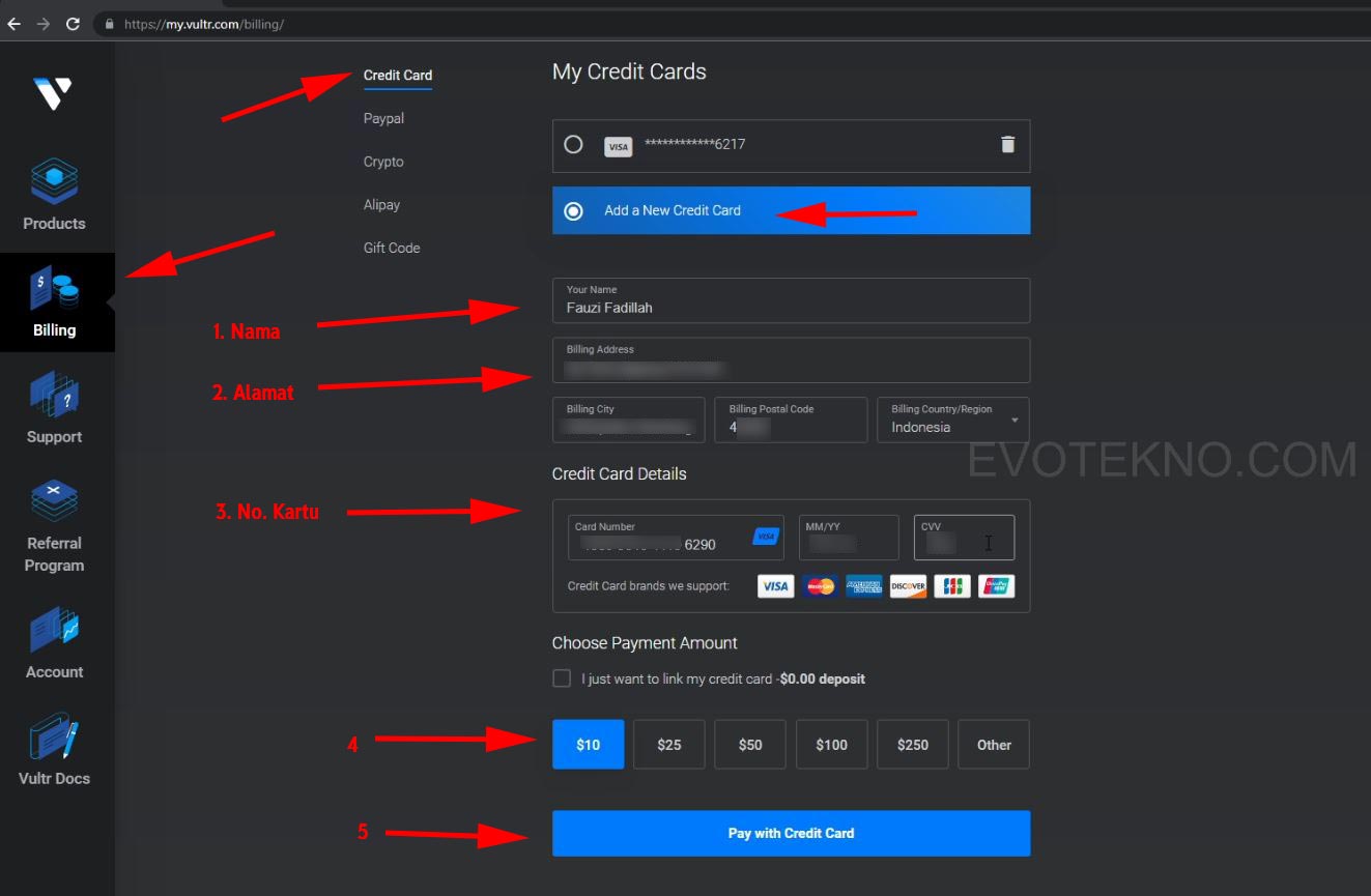 2. Sekarang buka dan login pada website Vultr, setelah itu masuk ke menu “Billing” pilih pembayaran “Credit Card” lalu klik “Add a new Credit Card”