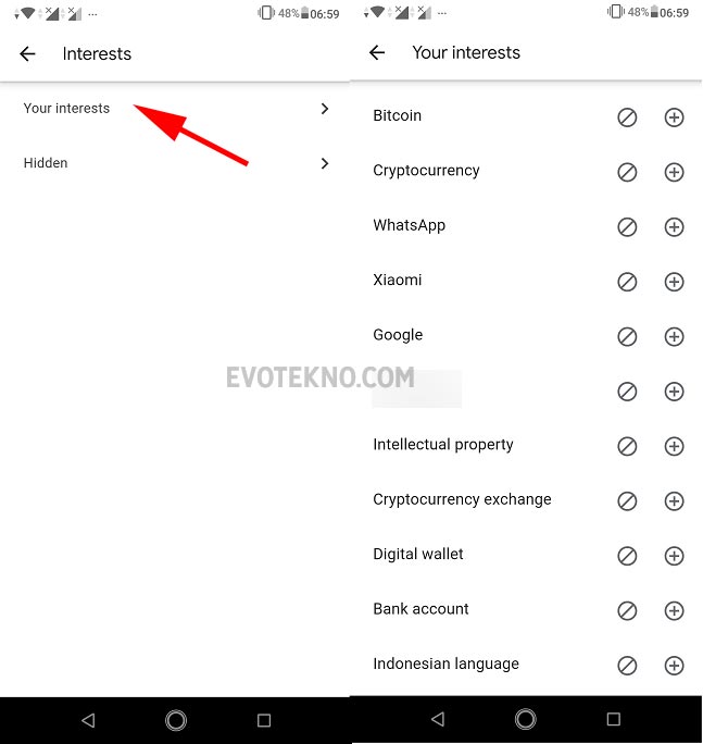 3. Terakhir pilih “Your Interest“, nantinya akan terlihat riwayat aktivitas Anda ketika menggunakan pencarian Google. Tugas Anda bisa menambahkan atau melarang muncul lagi di Google Discover.Your Inteterst - Google Discover