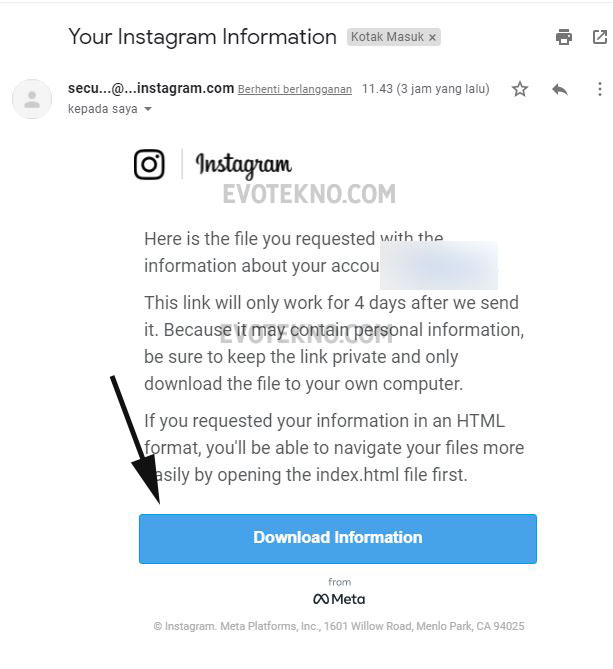- Saya sendiri tidak lebih dari 1 jam, Instagram sudah mengirimkan link download yang masuk ke e-mail, klik “Download Information“