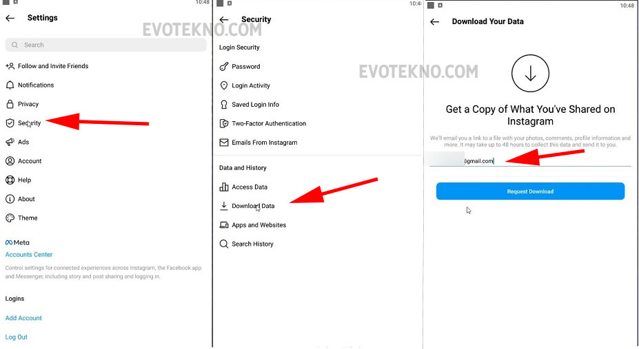 - Selanjutnya masukan e-mail yang nantinya akan dikirimkan file data, lalu masukan password akun Instagram Anda.
