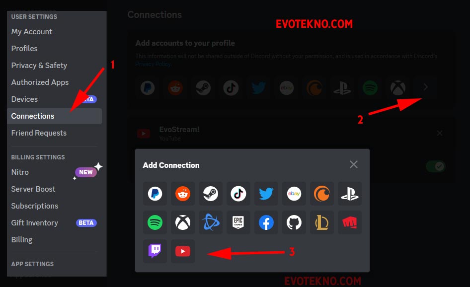 Maka jangan lupa untuk menghubungkan akun Discord dengan akun YouTube Anda. Agar nantinya jika sedang live streaming akan muncul aktivitas status seperti “Live on YouTube” atau “Live on Twitch”.