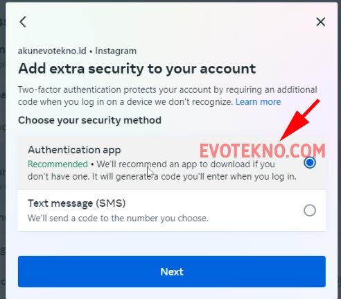 5. Pada bagian Add extra security to your account pilih “Authenticator app” karna kita pakai aplikasi password manager.