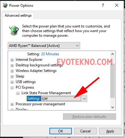 - Selanjutnya klik ikon tambah pada “PCI Express” lalu buka juga “Link State Power Management“, terakhir ubah Settings nya menjadi “Off“