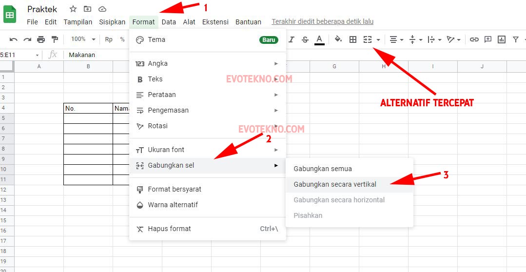 - Lalu klik “Gabungkan Sel“