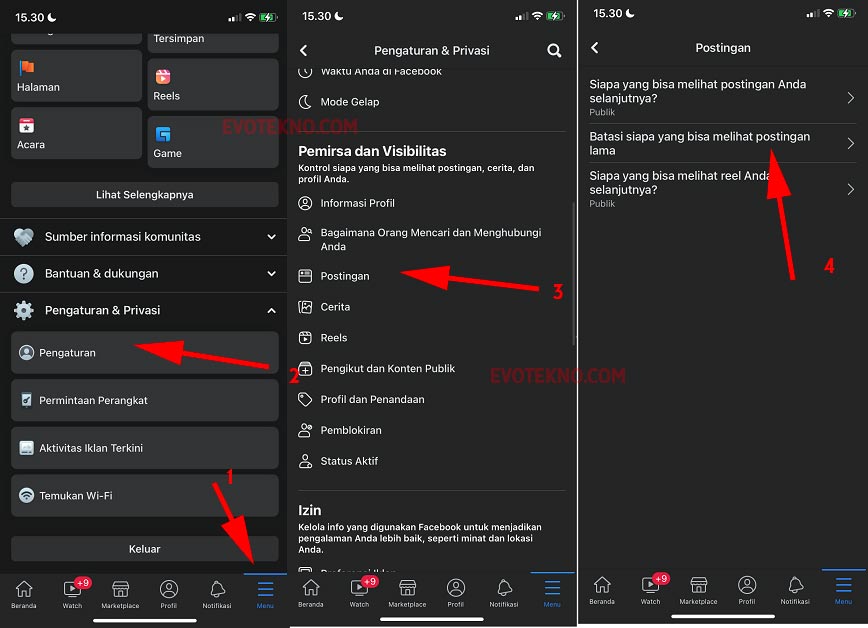 - Pertama buka “Menu” scroll ke bawah klik “Pengaturan“. Setelah masuk ke pengaturan, pada bagian Pemirsa dan Visibiltias klik “Postingan“. Nah, pilih “Batasi siapa yang bisa melihat postingan Anda“