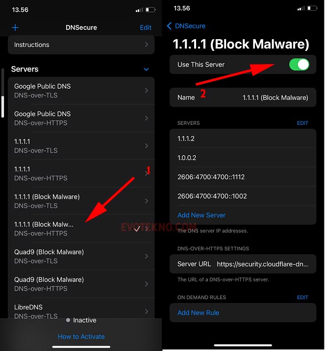 - Setelah terpasang, pertama pilih DoH misal 1.1.1.1 (Block Malware), lalu aktifkan; ini wajib Anda aktifkan terlebih dahulu agar DNSecure masuk ke pengaturan DNS