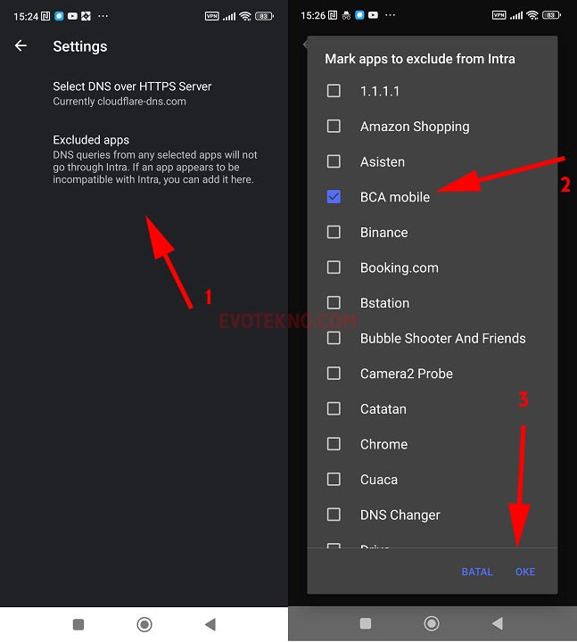 Agar aplikasi tertentu tak terpengaruh oleh DoH yang Anda pakai, pada pengaturan gunakan fitur “Exclude Apps” dan pilih aplikasi tujuan.